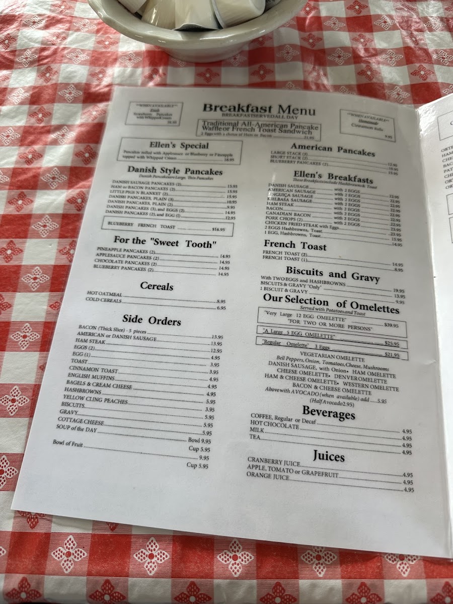 - Breakfast and Brunch: Includes specialties such as Danish Sausage Pancakes, Biscuits N Gravy, a 5 Egg Omelette, Vegetarian Omelet, Pork Chops and Eggs, Eggs and Bacon, Home Fries, and Toast French Toast. Traditional breakfast accompaniments like homemade cinnamon rolls and granola pancakes with banana are also available.